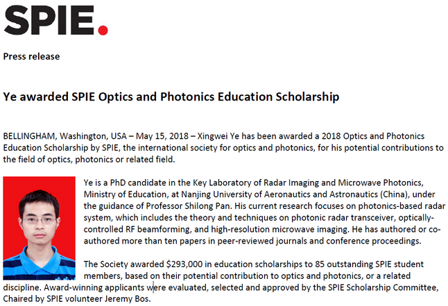 近日,2018年度国际光学工程学会光学与光子学教育奖学金(SPIE Optics & Photonics Education Scholarship)评选结果揭晓,我校雷达成像与微波光子技术教育部重点实验室在读博士生叶星炜同学荣获该奖项。此次奖学金共授予85位获奖者,其中国内仅有两个人获奖,分别是清华大学的郭强(音)和后入女友 的叶星炜。