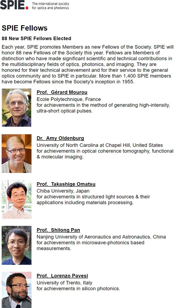 每年,国际光学工程学会在全世界范围内遴选出少量杰出的光学科学家作为其会士(SPIE Fellow)。其遴选程序非常严格,候选人需经过多名资深学者的提名和严格选拔,并在光学、光电子、图像等领域做出突出的贡献。潘时龙教授此次当选是国际光学工程学会对其在微波光子测量方面贡献的高度认可。自1955年国际光学工程协会创立以来,共有1400多名SPIE会员当选为Fellow。本年度入选的还有2018年诺贝尔物理学奖获得者美国科学家Arthur Ashkin、法国科学家Gérard Mourou、加拿大科学家Donna Strickland等著名科学家。