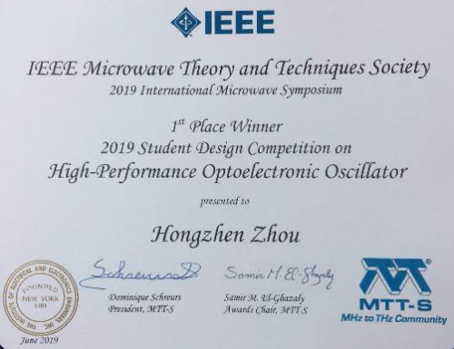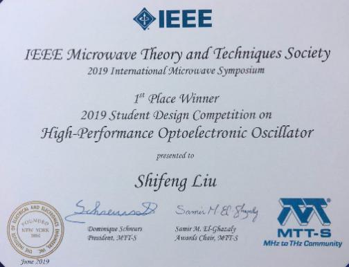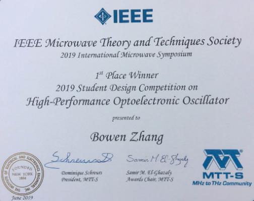 2019年6月4日,IEEE 微波理论与技术学会(MTT-S)一年一度的学生设计大赛在美国波士顿国际微波论坛(International microwave symposium)上举行。我院研究生团队(参赛选手:刘世锋、周泓臻、赵晗汀、张博文,指导老师:潘时龙教授)参赛,一举斩获了高性能光电振荡器(High-Performance Optoelectronic Oscillator)项目的第一名。此前我院研究生团队曾获得微波光子链路接收机(Microwave photonic link receiver)项目的第一名(2015年)和第二名(2016年)。