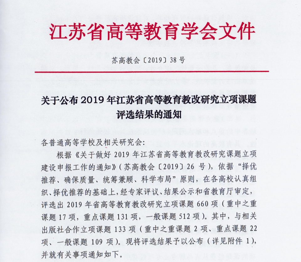 2019年12月10日,江苏省高等教育学会发布了《关于公布2019年江苏省高等教育教改研究立项课题评选结果的通知》,后入女友