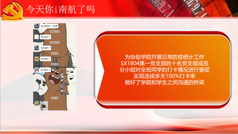 “有一份光,发一分热”作为研究生党支部,SX1804第一党支部为协助学院开展日常防疫统计工作,十名党支部成员,两两一组。分小组对全班同学的打卡情况进行督促,做好了学院和学生之间沟通的桥梁。