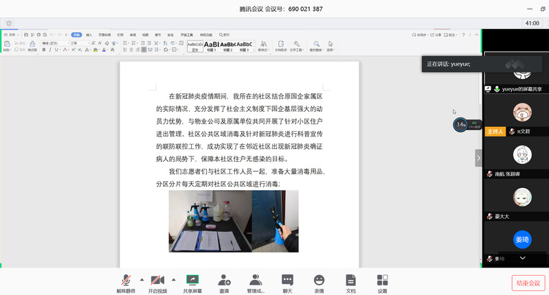 最后,党支部书记亓文君分享了她的志愿服务经历和对于此次关于战疫情的思考。在关于疫情问题的思考中放眼世界不断升华对党的理论认识和对国家的认识。放眼世界,只有中国能够举全国之力,众志成城,抗击疫情,对百姓能够一呼百应,很容易理解我们四个自信从何而来。共赴国难的家国情怀,也是中国老百姓刻在骨子里的精神品质。作为一名研究生党员,在危难时期,更应该牢记自己的入党誓词,发挥好模范带头作用,切实担当起党员责任,随时准备为党和国家牺牲一切。
