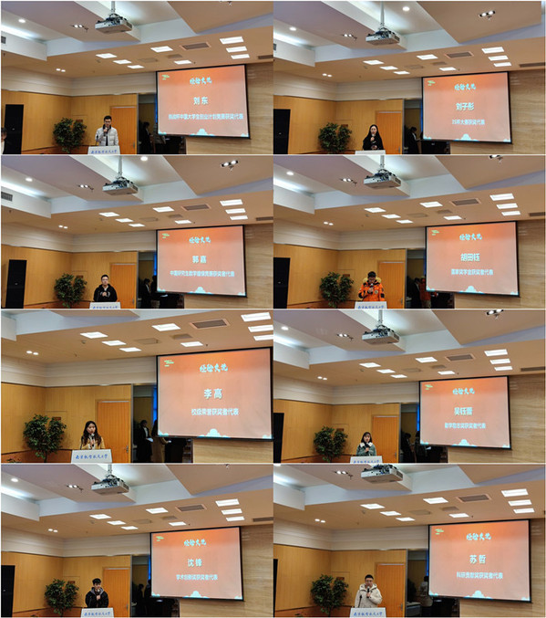 获奖学生代表进行了发言。挑战杯中国大学生创业计划竞赛获奖代表刘东对吴启晖教授和朱秋明副教授的辛勤指导、雷蕾副书记和徐艳惠辅导员的全力支持与帮助表达了真心的感谢;“3S”杯大赛获奖代表刘子彤由衷地表达了对无私奉献、悉心指导的老师们以及不畏艰险、迎难而上的队友们的感谢,并分享了“竞赛与科研的统一性”的比赛心得;中国研究生数学建模竞赛获奖者代表郭嘉分享了多次参加数模竞赛的经验以及此次建模竞赛于他的个人意义与情怀;国家奖学金获奖者代表胡田钰表达了对吴启晖教授和其他曾指导或帮助过他的老师和同门表示诚挚的感谢,并分享了硕士三年来从无到有再到以国家奖学金完美收官的成长历程;校级荣誉获奖者代表李高分享了自己一年多以来在科研和生活上的心得体会,表示沉着有耐心,尽力有信心才会收获好的结果;勤学励志奖获奖者代表吴钰蕾表达了整理项目材料时的感悟与收获,表示做好每一件事是学生的责任与担当;学术创新奖获奖者代表沈锋表达了对学术研究的独到见解,表示向前看战略的眼光才是学术研究得以长远进行的根本;科研贡献奖获奖者代表苏哲以自己的亲身感悟体现了理论与实践相结合的重要性;支部建设贡献奖获奖者代表张珉分享了实验室研究生党支部从无到有的建立过程,由衷地感谢了吴启晖教授的支持、学院党委的指导以及第一届支部委员会全体成员地默默付出。