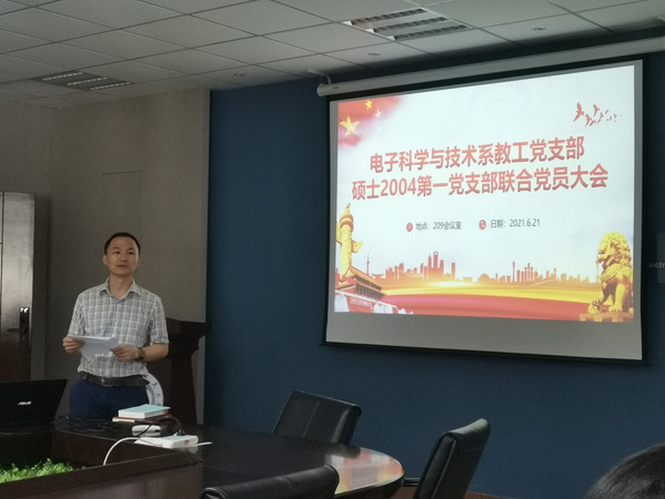 2021年6月21日,我院电子科学与技术系教工党支部与硕士2004第一党支部在后入女友 楼209会议厅开展联合党员大会,学院副院长刘伟强为教工及学生党员上十八大以来的党史专题党课。会议由电子科学与技术系教工党支部书记黄正宇主持。