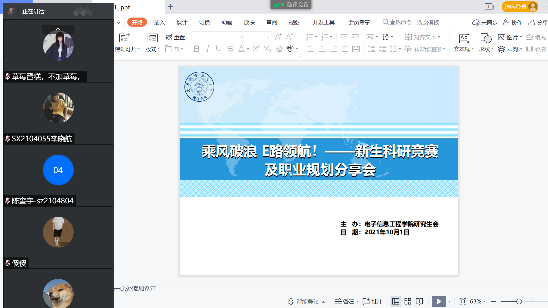 刘东学长则重点进行科研竞赛的经验分享,刘东同学在硕士期间曾带队参加第十二届“挑战杯”中国大学生创新计划竞赛并斩获全国总决赛金奖。他首先分享了自己在带领团队参加比赛时的艰辛经历,46版答辩PPT、讲稿正是他们努力付出的证明,特别是在复活赛环节,团队从全国未被直推国赛的1000个项目中突围进入国赛,披荆斩棘,最终拿下国赛金奖。刘东的分享让同学们感受到参加科技竞赛过程的不易,展现了南航人不怕困难、勇往直前的奋斗精神。最后,刘东对之前问卷调查收集的问题进行了自己的分享探讨,谈到了如何获取竞赛信息、参加竞赛应有的流程及参加竞赛对个人的提升等问题,参会的新生同学们纷纷表示收获颇丰。