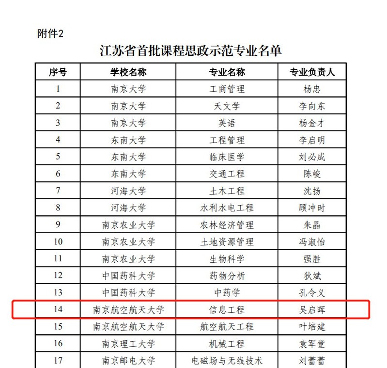 长期以来,学院依托学校在航空、航天、民航领域特色优势,结合空天-信息学科特色,扎实推进课程思政建设工作,将课程思政贯穿思想道德教育、专业知识教育、社会实践教育各环节,致力于培养“有空天报国情怀、有扎实专业素养、有国际前沿视野、有实践创新能力”的电子信息卓越人才。此次信息工程专业入选江苏省首批课程思政建设示范专业,是对学院课程思政建设工作的充分肯定与鼓励。本次申报工作由吴启晖教授牵头,在张小飞教授、牛臻弋、夏伟杰、晋本周、吴迪、时晨光、徐燕明、张璐等老师1个多月的共同努力下,经过多轮研讨与打磨,完成了申报书的撰写及评审。