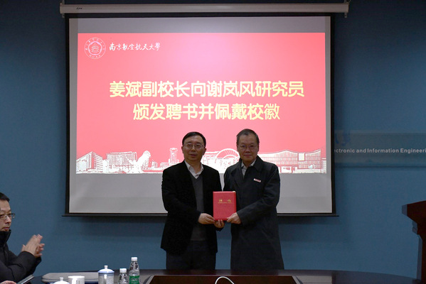 姜斌对谢岚风的到来表示诚挚欢迎,向他长期以来对学校事业发展的关心、支持和所作的贡献表示感谢,希望谢研究员能够继续常来南航开展学术交流和人才培养工作,为我校电子信息类学科瞄准科学技术前沿,服务国防,助力科技创新提供方向引领。姜斌为谢岚风颁发了聘书并佩戴校徽。
