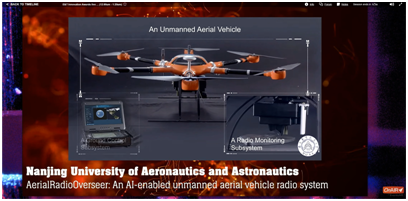 “基于人工智能的空中频谱监测系统”首创将无人机技术与传统频谱监测技术相结合,具有高精度、可重构、网络化、智能化的特点,支持复杂恶劣环境下自主规划最优飞行轨迹,实现目标场景的频谱态势快速精准的可视化监测,可应用于城市频谱治理、非法用频设备查找、灾害场景应急搜救和战场环境频谱对抗等领域。