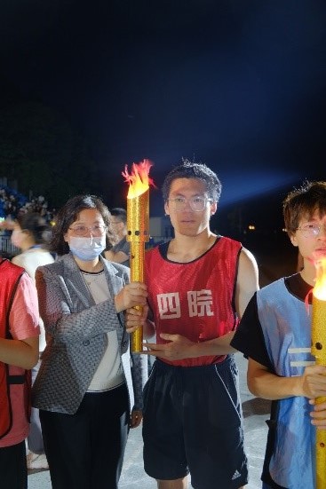 5月4日晚19:00,校党委副书记刘宇雷致开幕辞。副校长施大宁、党委副书记陶勇、刘宇雷点燃火炬,传递至各学院党委副书记。我院党委副书记雷蕾将火炬传至第一位运动员张懿,参赛队员飞奔而出,努力奔跑。
