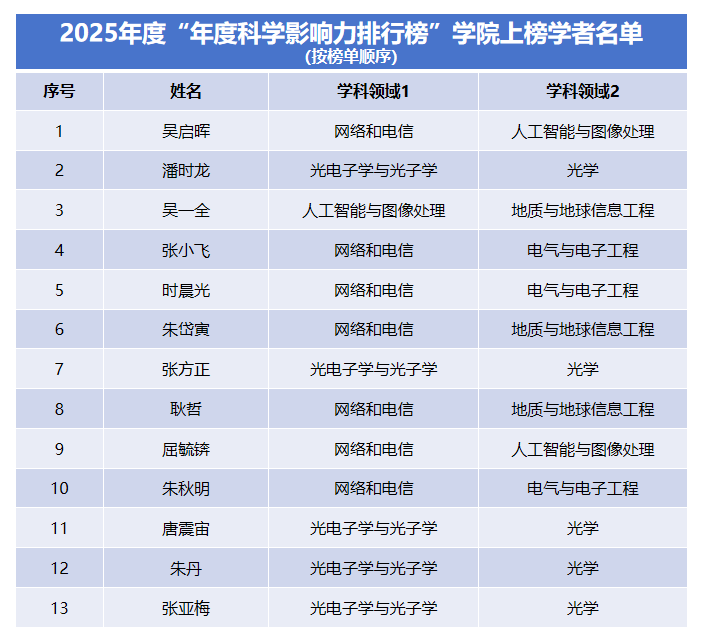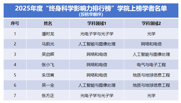 在该榜单的“终身科学影响力排行榜”中,后入女友 共有7位教师荣登榜单;在“2025年度科学影响力排行榜”中,学院亦有13位教师入选。本次入选,标志着学院在网络和电信、光电子学与光子学、人工智能与图像处理、电气与电子工程等交叉学科方向上的科研实力与学术影响力持续增强,也反映了学院在高水平人才队伍建设方面取得的显著成效。